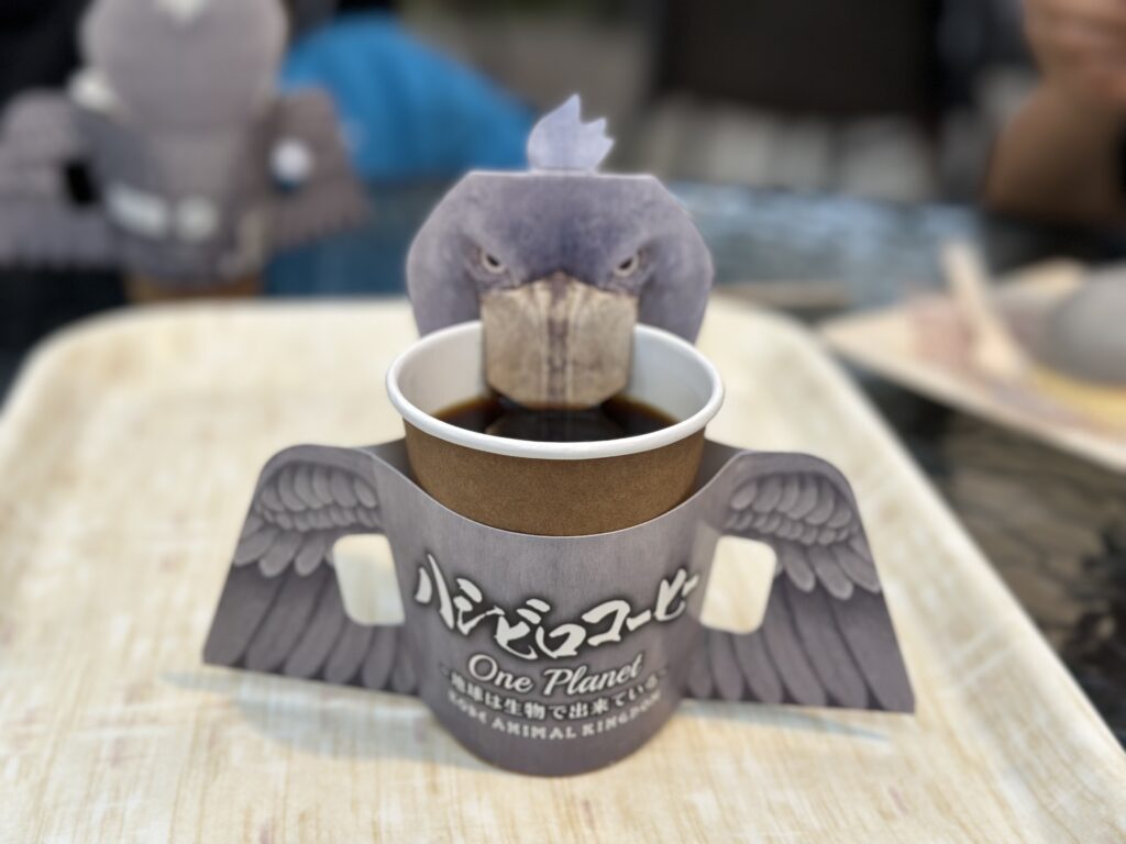 • ハシビロコーヒー&ケーキ: 凛々しい顔が再現されたケーキは食べるのがもったいないクオリティ。コーヒーと一緒に至福の時間を。