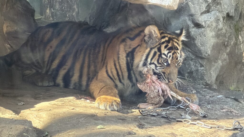 サポーターからの寄付金は、動物たちの飼育環境改善や、いつもより少し豪華な「特別メニュー」に充てられています。 今回のハイライトは、トラへの給餌。 目の前に現れたのは、なんと「毛皮付きの鹿肉」でした。毛皮から肉をはぐ事で暇つぶしになり、そして、低脂肪高たんぱくで栄養も良いとの事。