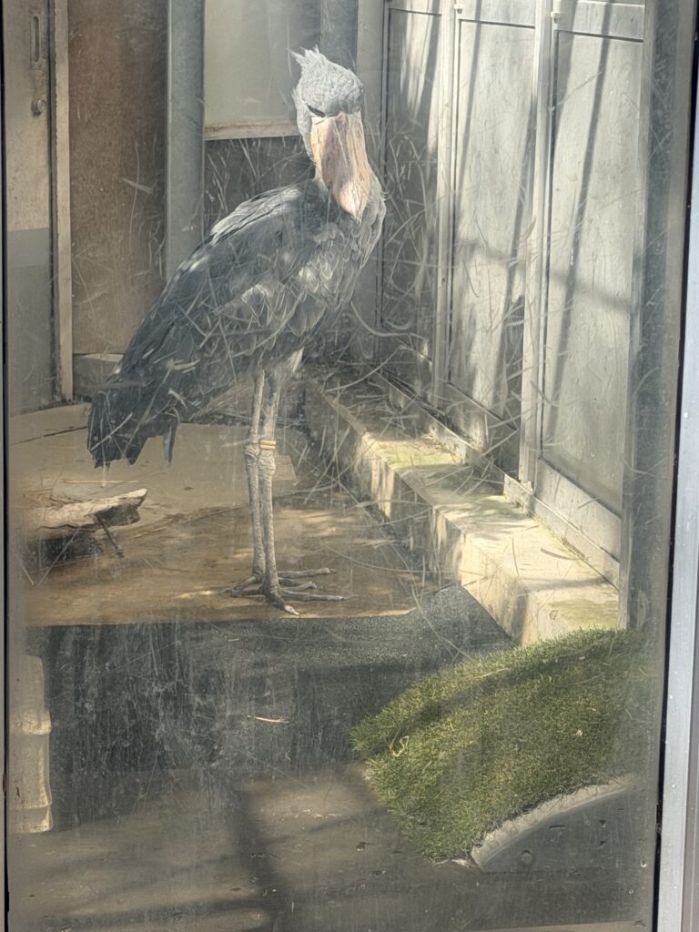 - 本日の遭遇: 残念ながら、今回は観察しやすい位置にはおらず、彼らの気分は「お休みモード」でした。ハシビロコウ展示場のアクリル板の汚れは訪問するたびに気になるところでした。